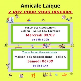 – au forum des associations le mercredi 3 septembre de 14h à 20h au complexe sportif Jean-Marie-Bellime salle Léo-Lagrange – pour les personnes qui ne pourront se rendre au forum,...