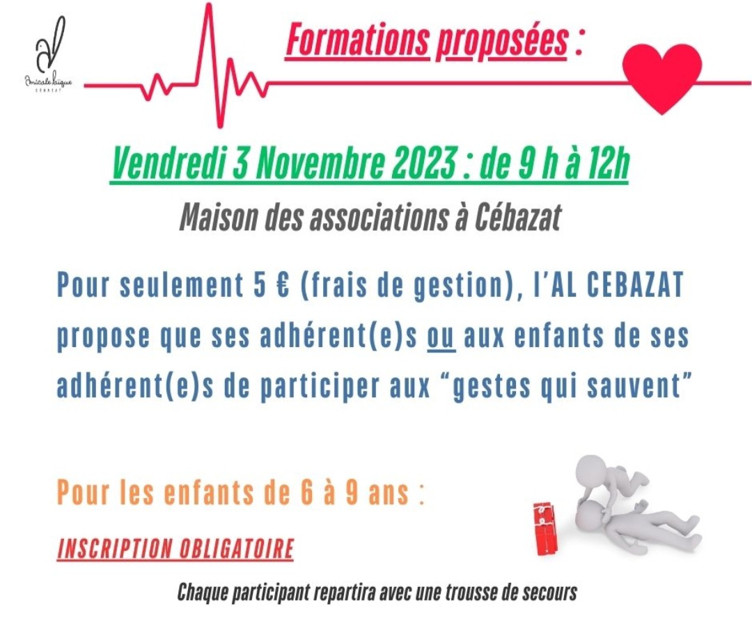 Formation premier secours par Inès PEREIRA · 24 octobre 2023 La formation premier secours pour les 6 à 9 ans sera organisée le Vendredi 3 Novembre 2023. Inscription obligatoire : amicalelaique63118@gmail.com Bulletin d’inscription