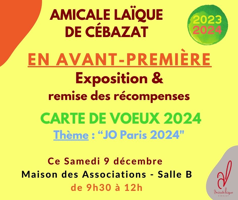 En avant-première, venez découvrir ces réalisations avant de connaître la « carte de voeux officielle 2024 » de l’Amicale-Laïque Cebazat à 11 heures décidé par un jury composé de Corinne Bernon, Présidente de l’ALC, M. Neuvy, Maire de Cébazat, Dominique Boulier – Trésorière adjointe, Christine Zorzi – Membre du CA, M. Verdier – Directeur du CACF, Mme Fournier – Boulangerie Fournier.